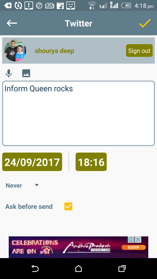 Step 5: Select the time you would like to publish your post or send message and cilck on the tick mark at the top right of the page.